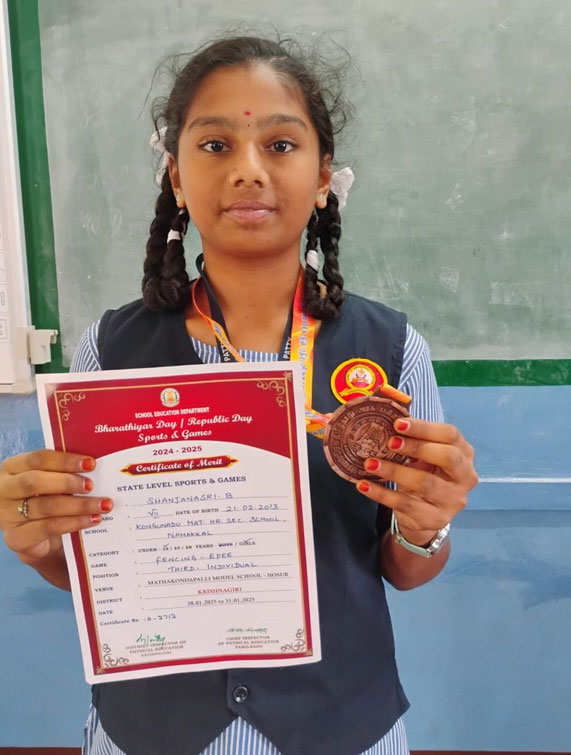 Our student from class VII Standard Sanjana sri went for Fencing Competition at Hosur,Krishnagiri District. She participated Individual Fencing State level match. She won Third place with certificate and Bronze medal.